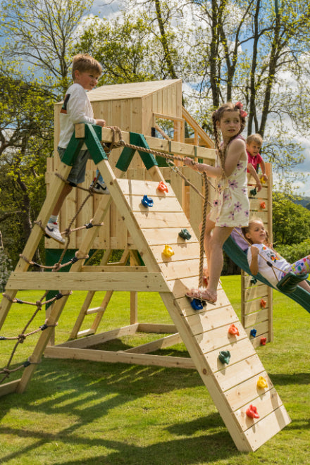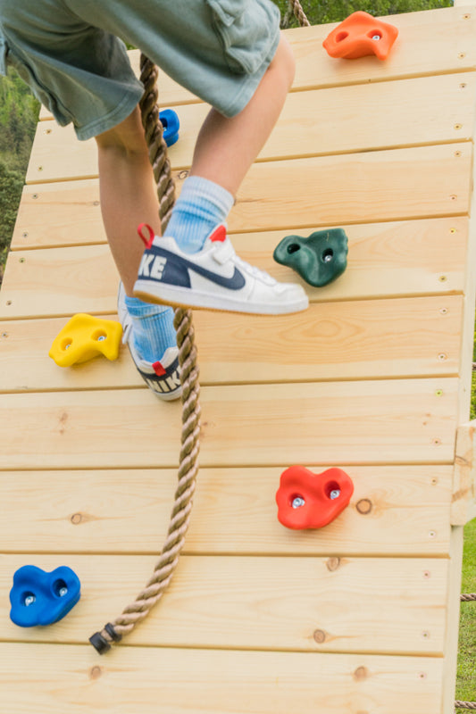- einer Kletterwand aus Holzgestell, die mit Klettersteinen versehen ist, wie du sie auch aus Kletterhallen kennst und