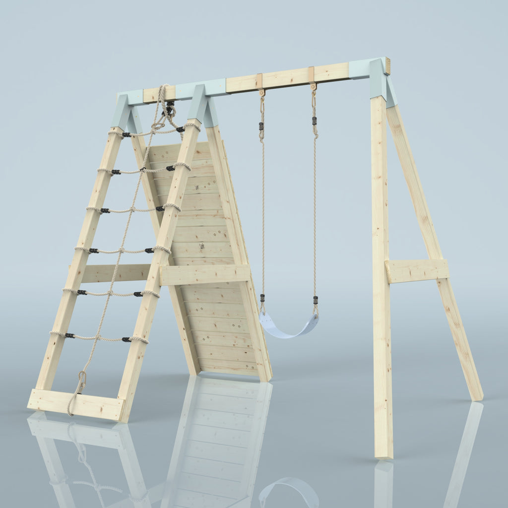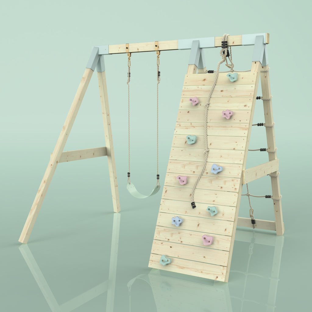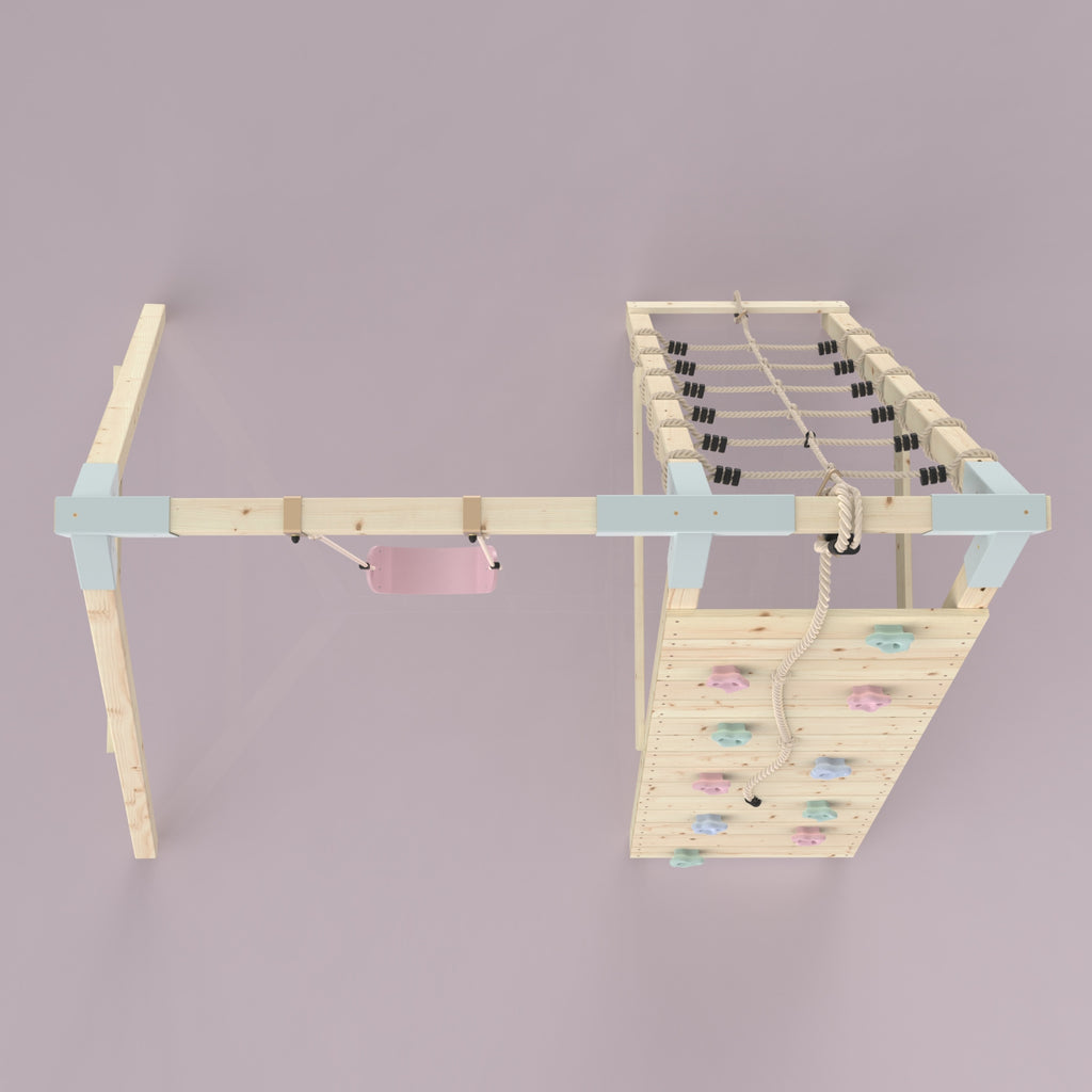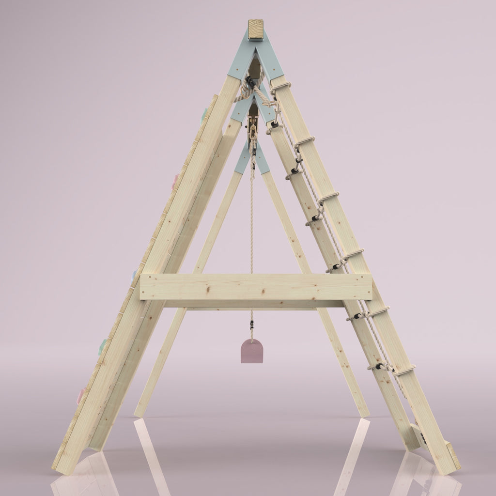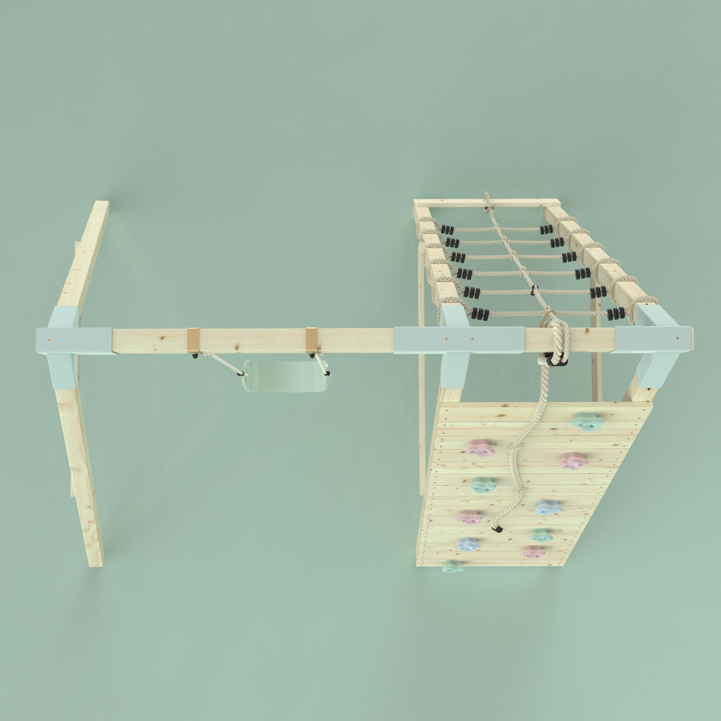 Kletterwand mit eisblauen Klettersteinen und Metallverbindungen bei allen Farbvarianten